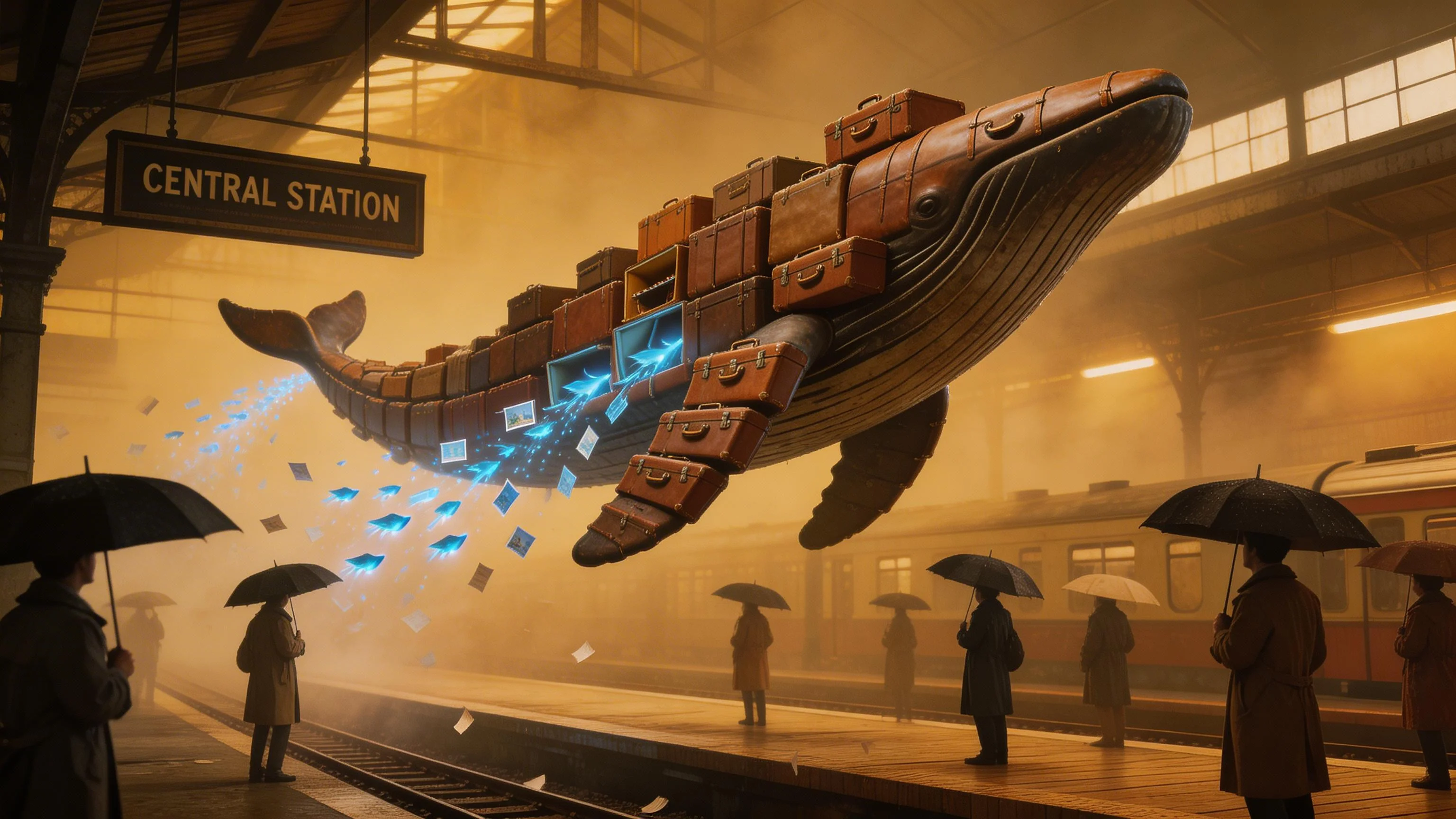 A massive whale made entirely of stacked vintage suitcases floats through a foggy train station, each suitcase slightly open with glowing postcards spilling out like bioluminescent fish. Travelers below hold their umbrellas against the paper rain. Hyperrealistic, moody tungsten lighting.