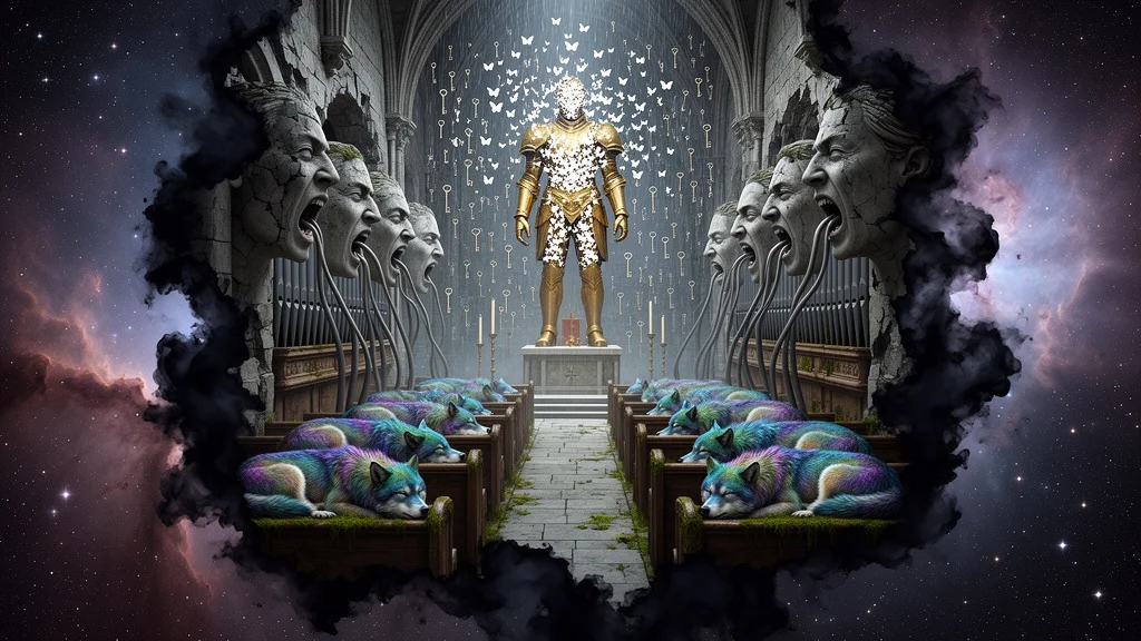 A crumbling stone cathedral floating in the center of a nebula made of black ink and glitter. The "pipe organ" is a row of colossal, screaming stone heads with pipes growing out of their tear ducts. The pews are rows of sleeping, iridescent wolves covered in moss. Instead of a priest, a hovering, 20-foot-tall suit of golden armor stands at the altar, but the armor is hollow and filled with a swarm of white butterflies that form the shape of a human face. The "rain" falling inside the cathedral is composed of tiny, glowing skeleton keys. Dark fantasy, epic scale, ethereal lighting, intricate gothic detail.